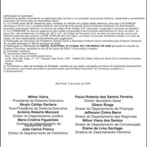 EDITAL ELEITORAL Nº 01/2026, DE 02 DE MARÇO DE 2026”, para o quadriênio 2026/2030, ratificado, retificado e aprovado pela Assembleia Geral Extraordinária realizada na Rua São Jorge, nº. 777, Tatuapé, São Paulo, CEP.: 03066-020 (Salão Nobre do Sport Club Corinthians Paulista), nesta Capital, no dia 12 de março de 2026.