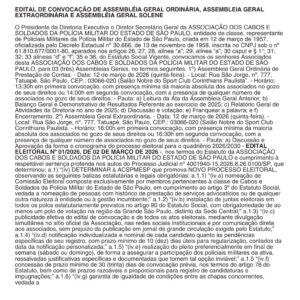 O Presidente Eleitoral Geral e a Secretária Eleitoral Geral, quadriênio 2026/2030, dando cumprimento ao disposto nos itens 1.4 e seguintes do EDITAL ELEITORAL Nº 01/2026, DE 02 DE MARÇO DE 2026”, ratificado, retificado e aprovado pela Assembleia Geral Extraordinária realizada na Rua São Jorge, nº. 777, Tatuapé, São Paulo, CEP.: 03066-020 (Salão Nobre do Sport Club Corinthians Paulista), nesta Capital, no dia 12 de março de 2026, torna público a íntegra do referido edital, bem como os modelos de documentos que deverão ser fornecidos aos candidatos, pela secretaria da Associação dos Cabos e Soldados da Polícia Militar do Estado de São Paulo – ACSPMESP, nos termos do artigo 87, caput do Estatuto da ACSPMESP.